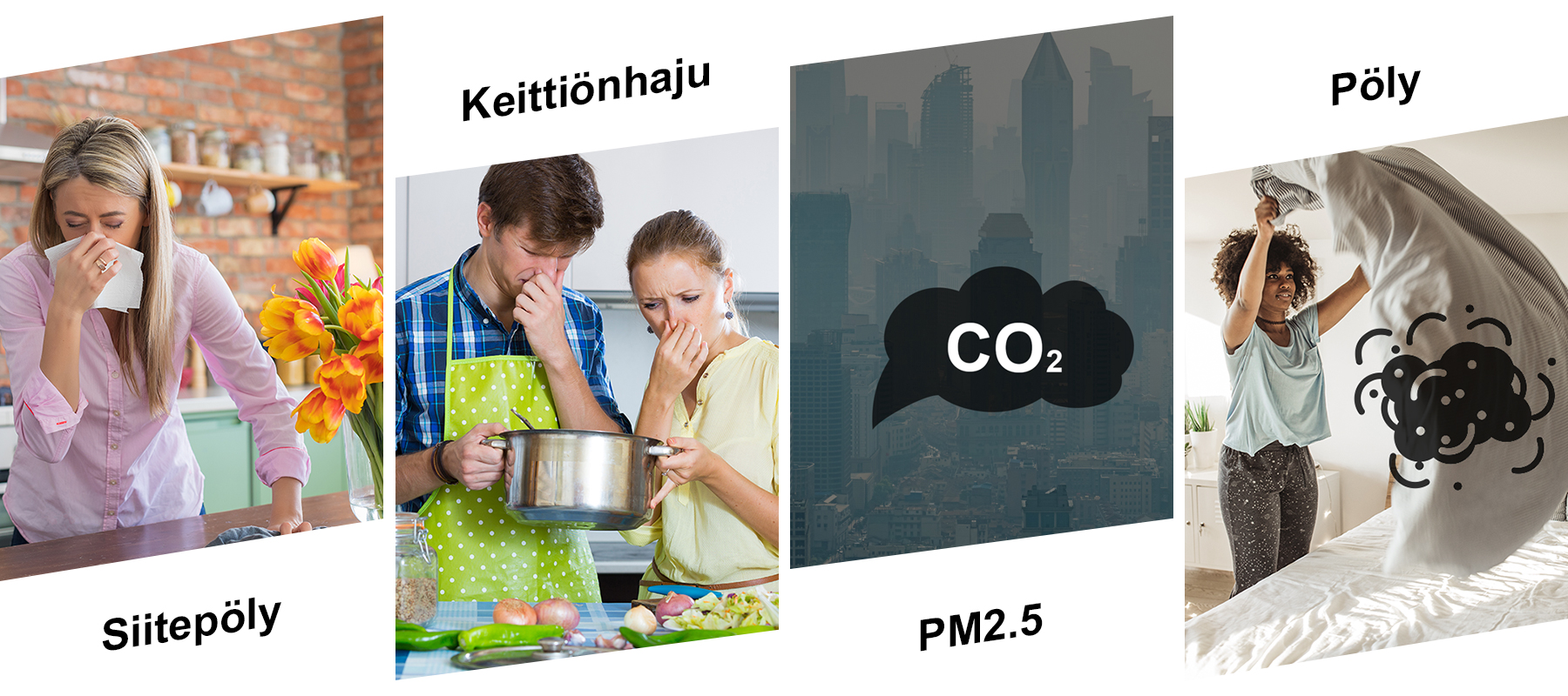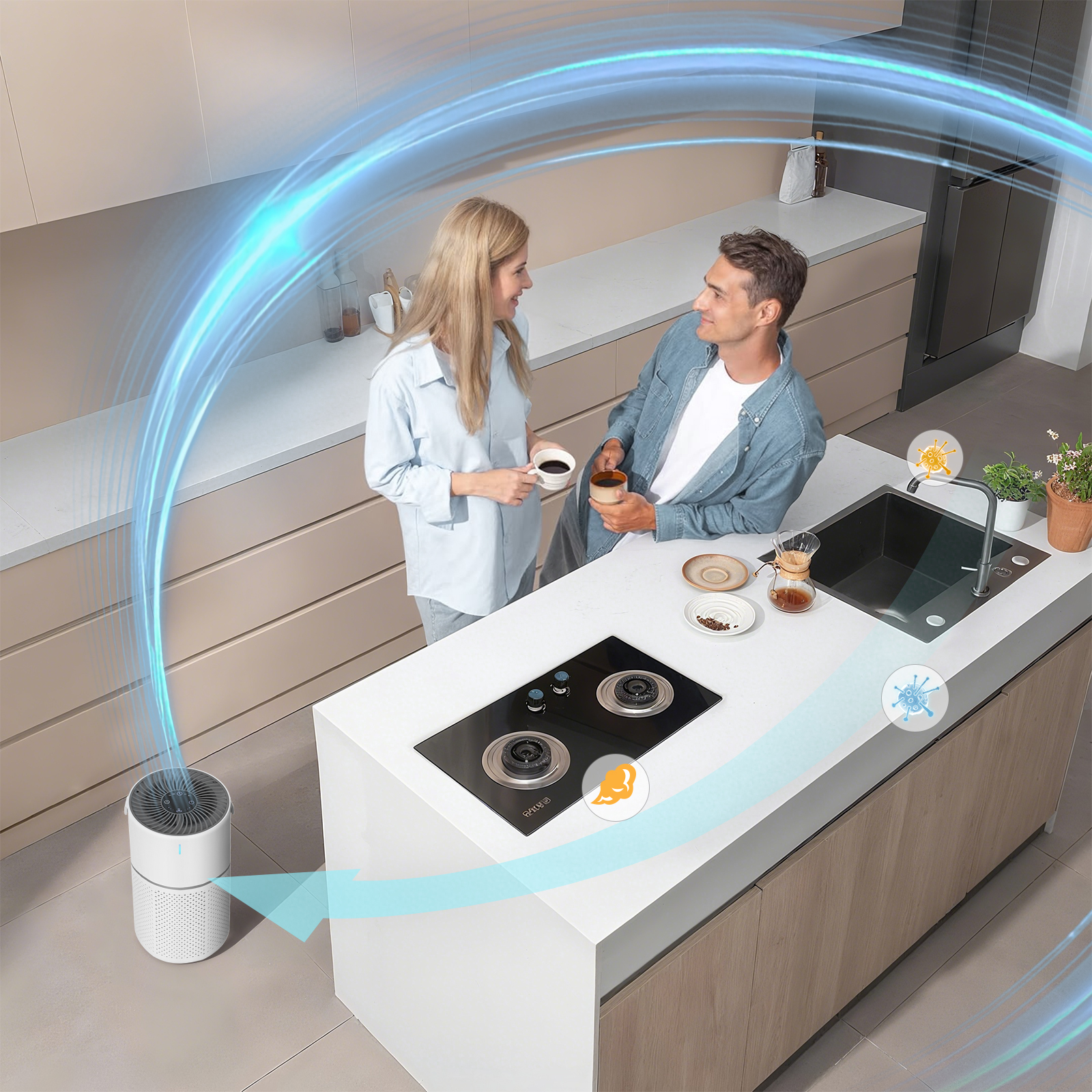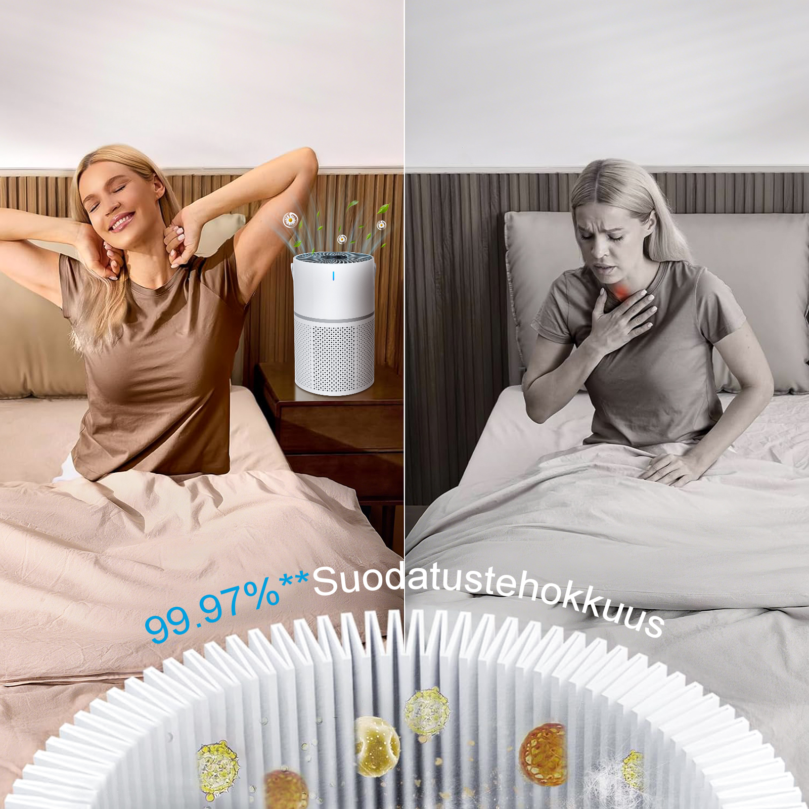 - Huipputehokas kolminkertainen suodatus: Kolmikerroksinen suodatin vangitsee pölyn, PM2.5-hiukkaset ja haitalliset kaasut tehokkaasti.